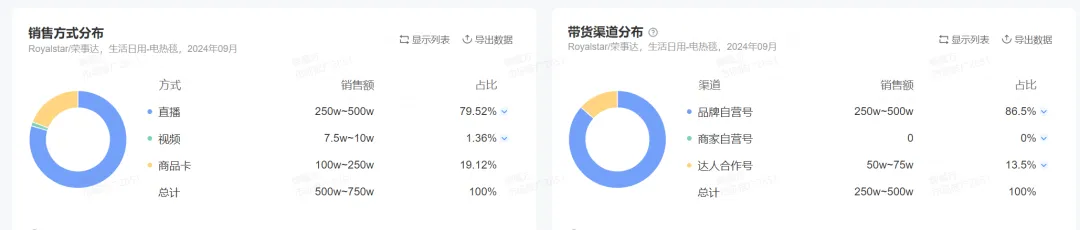 电热毯商品通过品牌自播方式销售,销售额超过250万元,占比高达86%,销售方式以直播为主,商品卡带来的成交也极为可观占比接近20%。