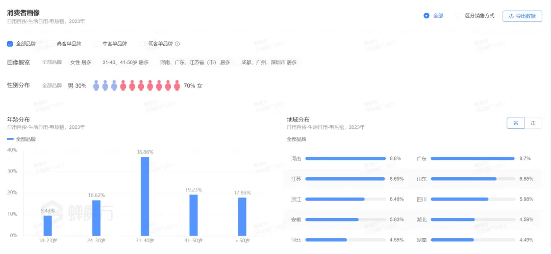 在地域分布上,由于南方城市冬季没有供暖且较为潮湿,购买潜力惊人。在2023年的全年消费占比分布中广东省以8.7%的比率位居第二,广州、杭州、深圳、苏州等城市均有较高的消费占比。