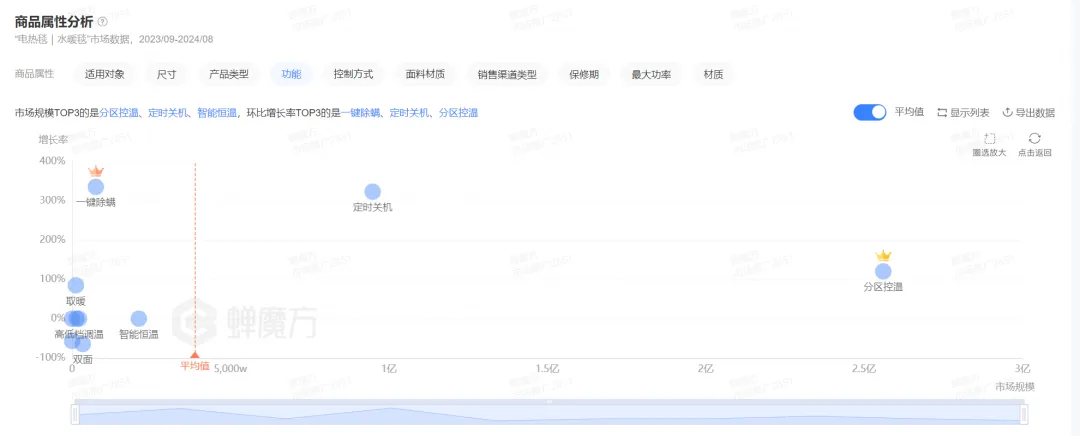 2023年9月至2024年8月期间,抖音平台电热毯产品功能市场规模TOP3分别是分区控温、定时关机、智能恒温,环比增长率TOP3的功能是一键除螨、定时关机、分区控温。