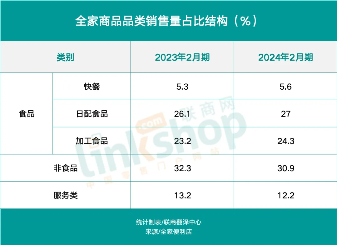 这说明全家的市场定位以及核心竞争力依然集中在食品类商品上,服装类商品并未显著改变整体销售结构。