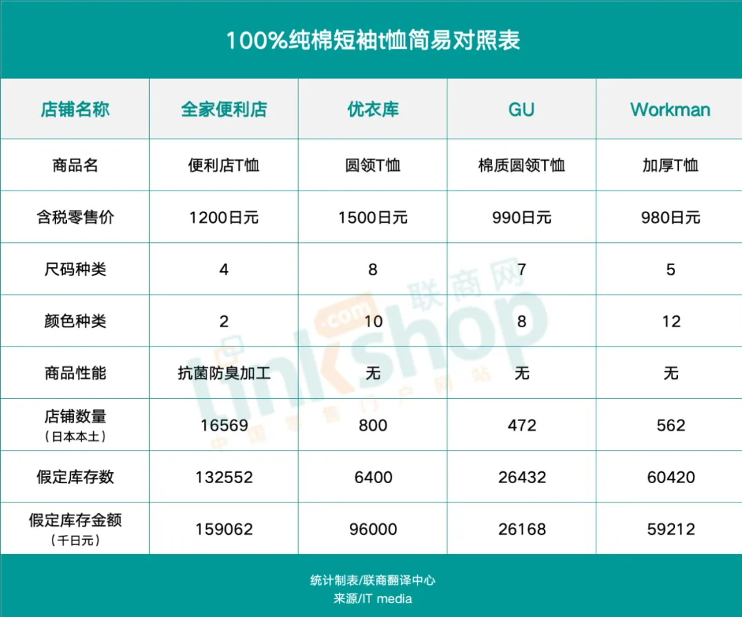与专业服装连锁店相比,Convenience Wear系列产品的颜色和设计显得较为逊色,商品阵容失去了选择的乐趣。此外,价格和尺码选择也没有优势。就商品的性能表现尚可,算是一大亮点。以热销的条纹袜和纯棉T恤为例,假设在所有店铺铺货,每个SKU平均配置一件,看看全家与其他几大服装品牌的商品基本情况。
