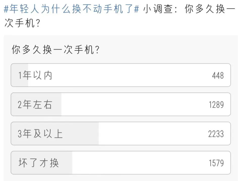 近日,一则#年轻人为什么换不动手机了#的话题登上热搜,截止6月28日,在微博平台已有6亿次的阅读,三万人参与讨论。而在更换手机频率的调查中,3年及以上的更换周期占比最多,与以往“一年换一次”的换新速度相比,现在的年轻人对新手机的热度逐渐下滑。
