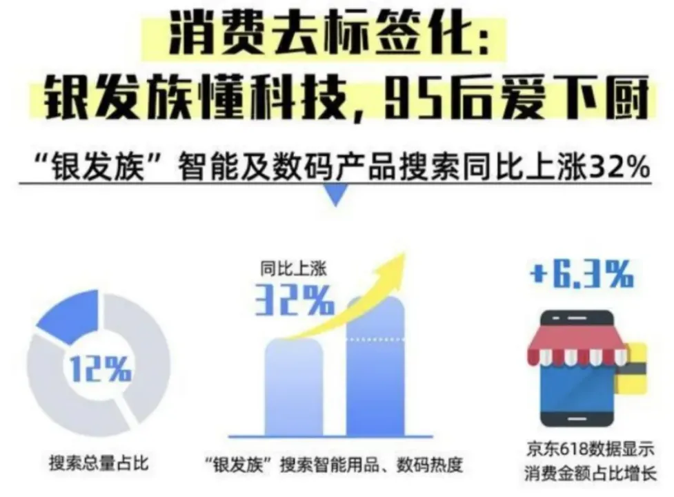 百度联合京东发布的《“6·18”消费趋势洞察报告》显示,2022年以来,“银发族”搜索“智能用品、数码产品”相关内容的搜索占比提升至12%,搜索热度同比上涨32%。2023年“6·18”购买智能用品、数码产品的消费者中,“银发族”的消费金额占比增长达6.3%。