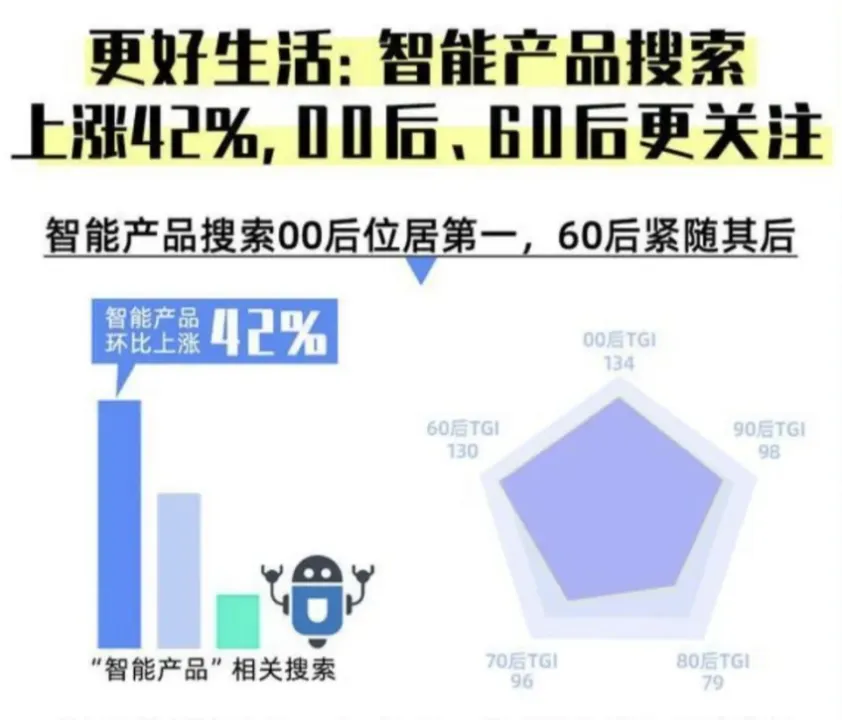 过去对电商平台避而远之的中老年群体,开始逐渐接受并熟练使用线上购物。相较于年轻人工作、生活高成本支出后消费意愿的削弱,老年人网络购物的潜力更大,对价值较高且实用性强的智能产品好感度更高。