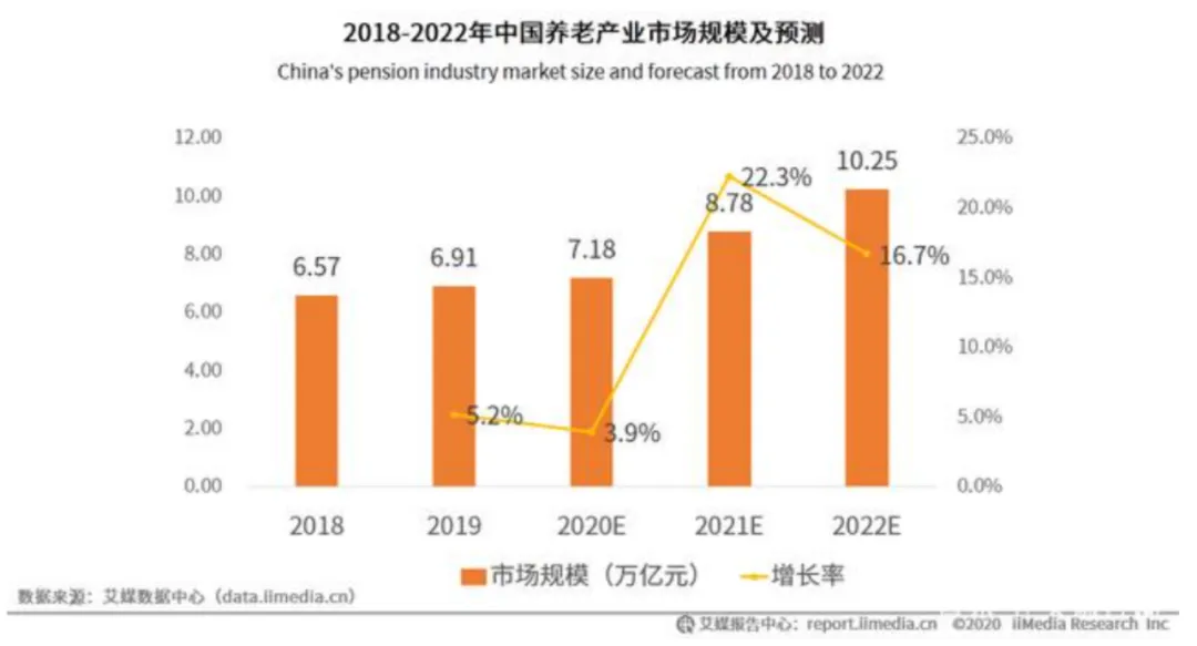艾媒咨询分析师指出,中国养老产业市场规模将会保持相对稳定的增长态势,到2020年预计突破10万亿元。世界卫生组织预测,到2050年,中国将有35%的人口超过60岁,养老产业成为万亿蓝海市场。