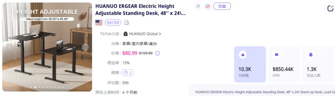 小店卖得最好的这款HUANUO ERGEAR电动升降桌在今年6月上线TikTok Shop,客单价为$80.99,桌子由两块无缝组装桌板构成,结实耐用,自带调节遥控,分为4级固定档和自由调节模式,可以依靠升级后的电机带来更为舒适的办公和电竞体验。