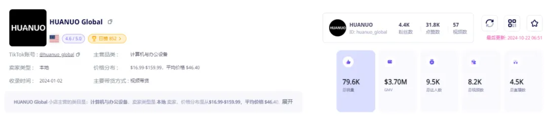 据Echotik数据显示,TikTok美国小店HUANUO Global于今年1月开通,总销量7.96万单,总销售额370万美金!