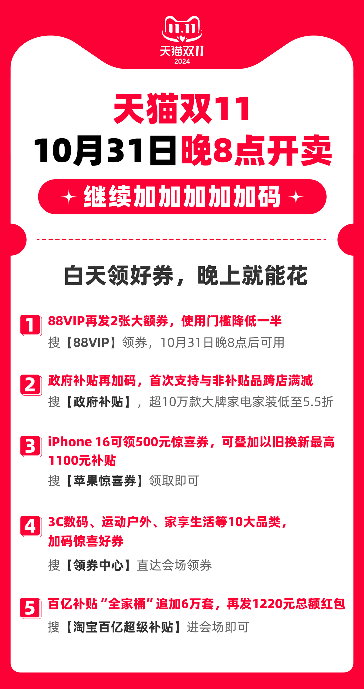在官方立减85折、跨店满300减50基础上,天猫双11加码加码再加码,叠加多种优惠券更好买,白天领好券,晚上就能花。