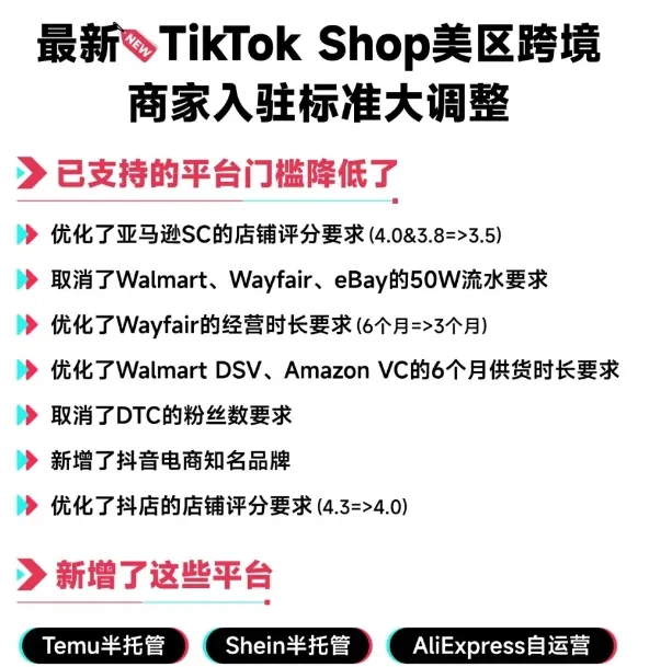 Walmart、Wayfair、eBay等平台的商家不再受限于50万流水的硬性条件,降低了入驻门槛。