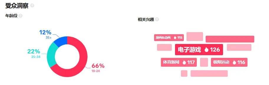 其中受众来源的年龄段较多的是18-24岁左右的人,占比66%,其次是25-34岁,占比22%。在对电子游戏、体育新闻和极限运动这一类感兴趣的用户对此话题的关注度较大。