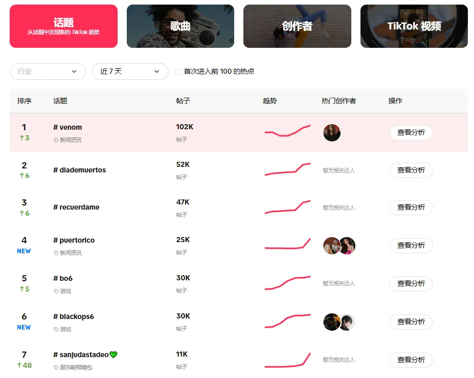话题#venom成为近7天的热门话题,标签下共有200万个作品,近期以102K帖子位列TikTok话题排行榜Top1。
