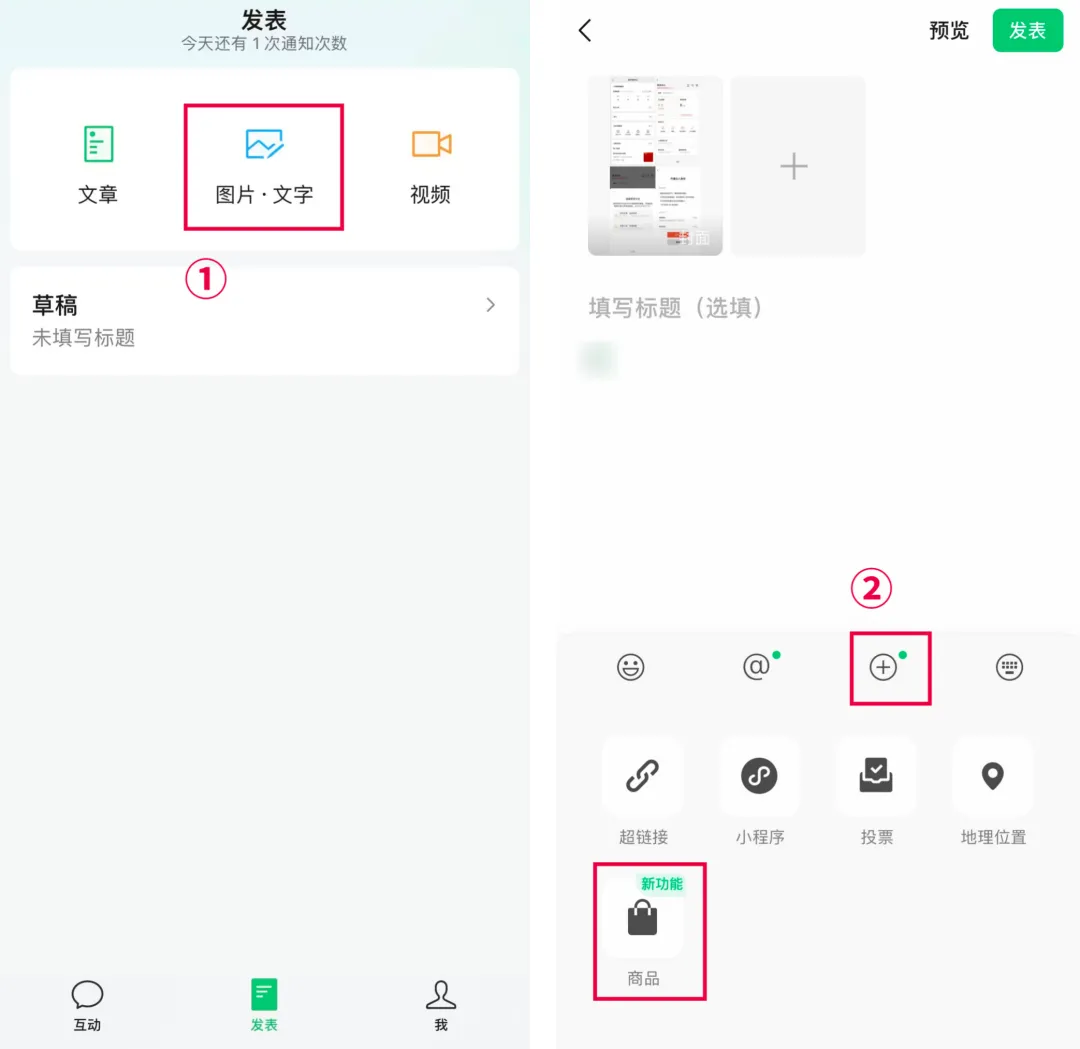 现在的小绿书带货,可以挂「联盟商品」与「小店商品」,意思是既可以直接带货拿佣金,也可以开店卖自家产品,怎么挂商品呢?看图。