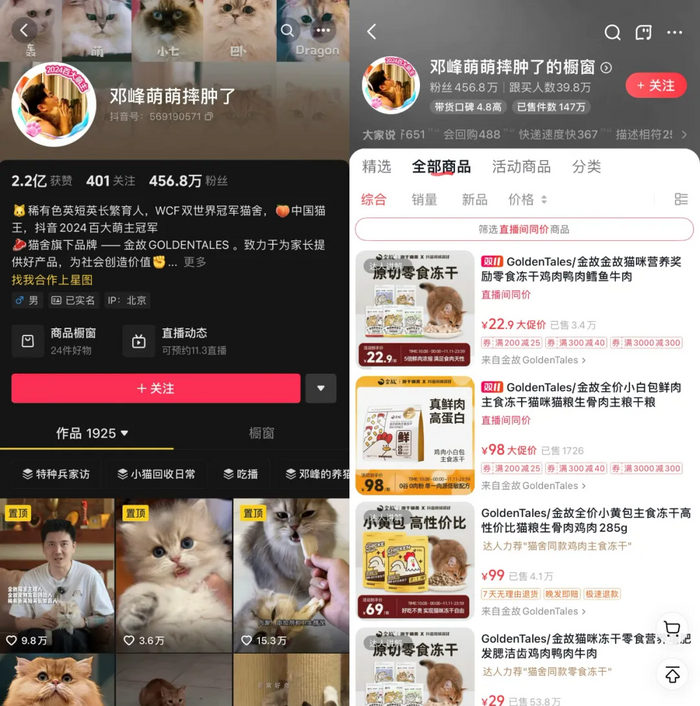 宠物博主邓峰转型创办的猫粮品牌金故也是其中之一。市面上宠物食品以次充好、偷工减料的乱象并不罕见,消费者很难发现,正是这些问题成为邓峰创办金故的契机,他希望为自家猫咪以及更多粉丝的猫咪提供安全靠谱的猫粮产品。在冻干猫粮等产品上,邓峰对品质一直坚持高标准,并通过直播间把这些理念传递出去,希望吸引对金故品质认可的消费者持续购买,而不只是冲动消费。