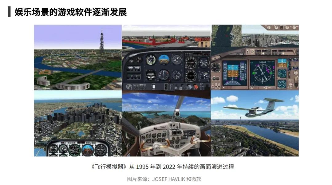 在生产力场景之外,一些面向娱乐场景的游戏软件逐渐发展。比如,1995年,《微软模拟飞行》这款游戏,让人们能够在家实现当飞行员的梦想,吸引了喜欢探索和尝试的用户。