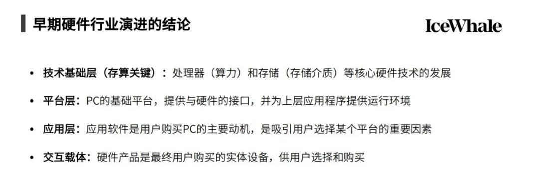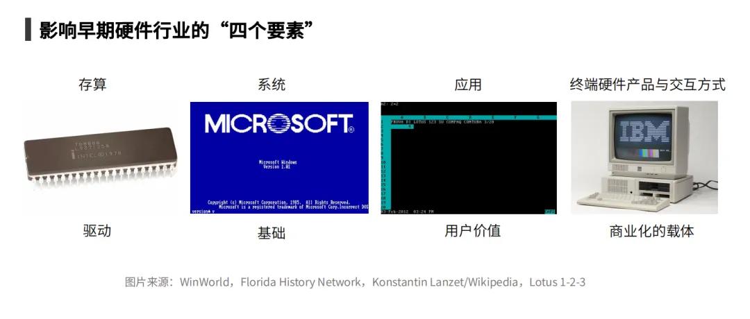 冰鲸科技创始人潘鑫磊详细研究了硬件行业的发展历史。在梳理了1980年代的芯片革新、PC的起步与渗透、1980-1990年的Dos与Windows 1.0系统变化之后,他发现芯片、系统、应用以及人机交互方式这四个关键因素不断迭代,相互促进,深刻影响了PC产业的生态演进。