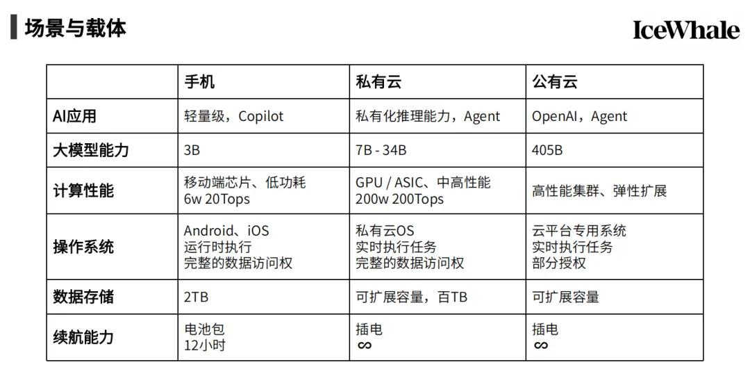 信息技术一直朝着便携的方向前进,这是人们长期的需求,比如,我们的电脑从没法移动的PC变成了随身携带的电子笔记本。然而,设备要想实现便携性,它的计算能力和续航就会受限,进而限制其能够运行的模型智力水平。当前手机能够运行的模型参数通常在3B参数级别。相较之下,私有云能够运行的模型参数在数十B级别,公有云则在百B级别。