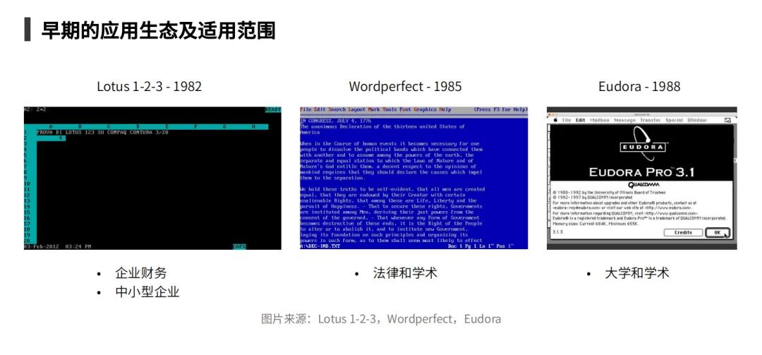 伴随着系统和电脑硬件能力的提升,早期应用逐渐发展起来。日渐丰富的应用,推动更多的企业与个人用户接触、购买电脑。我们来回顾下一些代表性应用,从中我们得以窥见,在PC生产力革命中,应用的渗透路径。