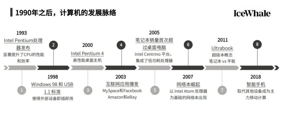 我们简单带过1990年后的故事。1990年代,我们迎来了英特尔奔腾处理器的发布、互联网应用的爆发、Windows 98的诞生、计算机外部设备连接标准USB 1.1,以及笔记本电脑的小型化与轻薄化,也就是我们常说的上网本和超极本。这一系列技术革新,指向了计算机发展脉络的不变趋势 —— 互联网真正走进了千家万户。