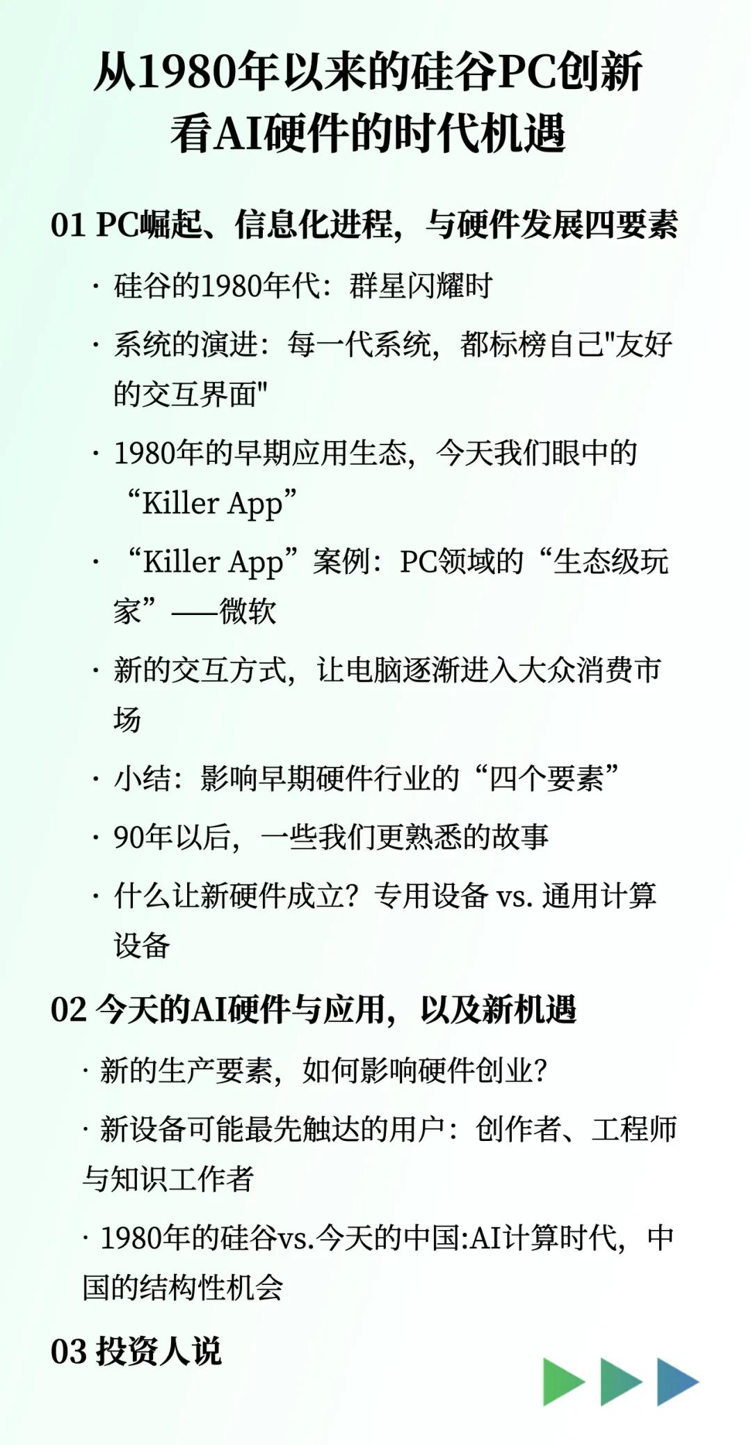 回顾PC的发展历程,不变的是:设备走向了便携化,越来越轻薄,人们可以随时随地进入数字世界;设备的功能从早期的生产力工具转向众多场景。那么,AI或者说大模型的应用会先在哪些垂直行业落地?AI的能力何时时会实现泛化?这与背后的计算能力、设备形态、操作系统的成熟度都密切相关,它们是相互耦合的。