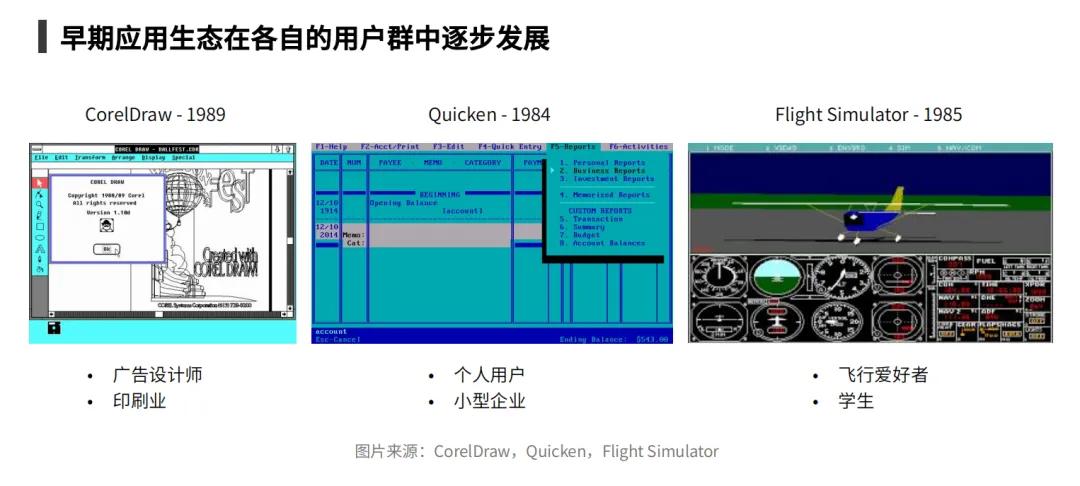 可以看到,早期的PC生态由重度的生产力工具与一些有趣的游戏应用共同构建而成,从产业和学术研究场景起步,逐渐破圈。然而,这个过程非常漫长,因为底层的DOS和GUI技术发展比较缓慢。