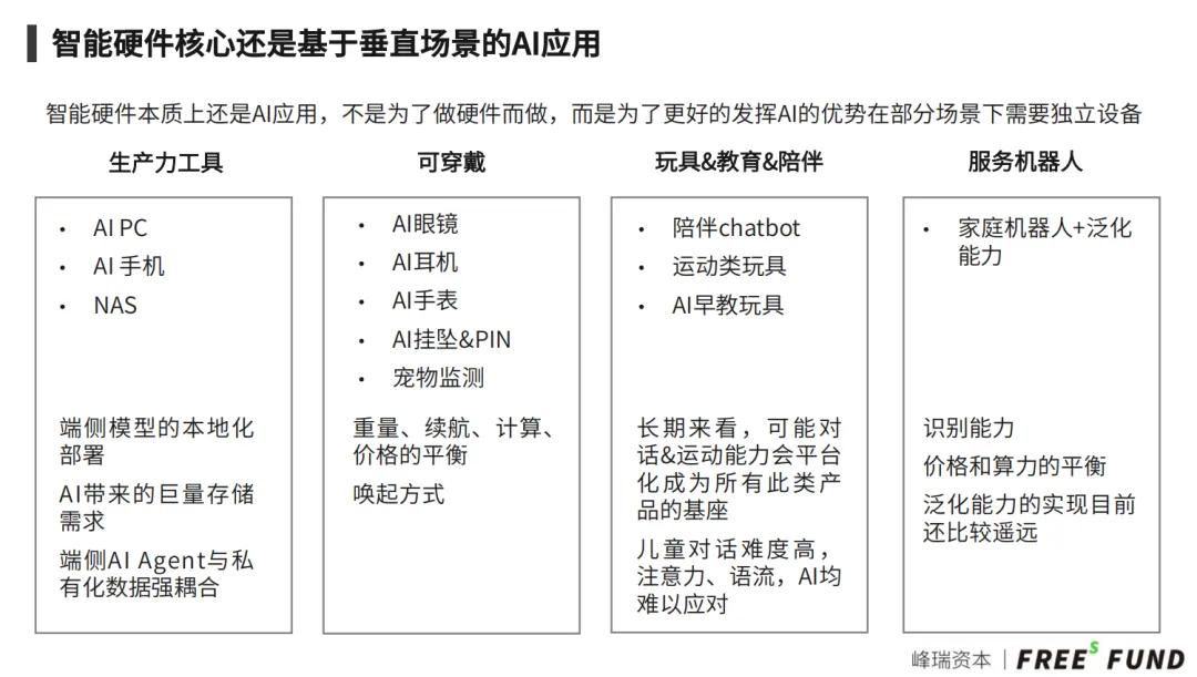 当下,新的LLM、Agent、多模态等技术走向大众市场可能也需要新的交互入口。由于芯片算力的提升,设备后端的处理能力更加强大,前端进一步往轻量化、便捷化的方向发展。未来的硬件可能会进一步减少对前端的依赖,用户在后端发出一个指令,设备就能自动完成任务。我留意到峰瑞也在关注类似AI/XR眼镜、AI耳机等各种各样的AI可穿戴设备。