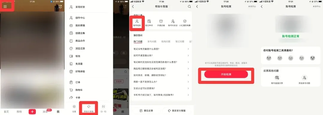 系统检测,点击小红书APP左上方的“三条杠”图标,点击下方进入“帮助与客服”界面,在自助工具栏点击“账号检测”;
