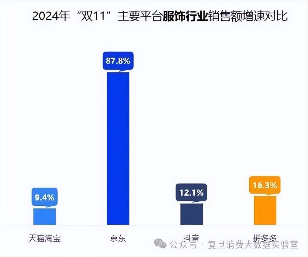 今年“双11”,服饰行业展现出了强劲的增长势头,各大平台均实现稳步发展,助推整体规模进一步扩大。其中,京东服饰品类上的优秀表现让人惊讶,以87.8%的销售额增速异军突起。