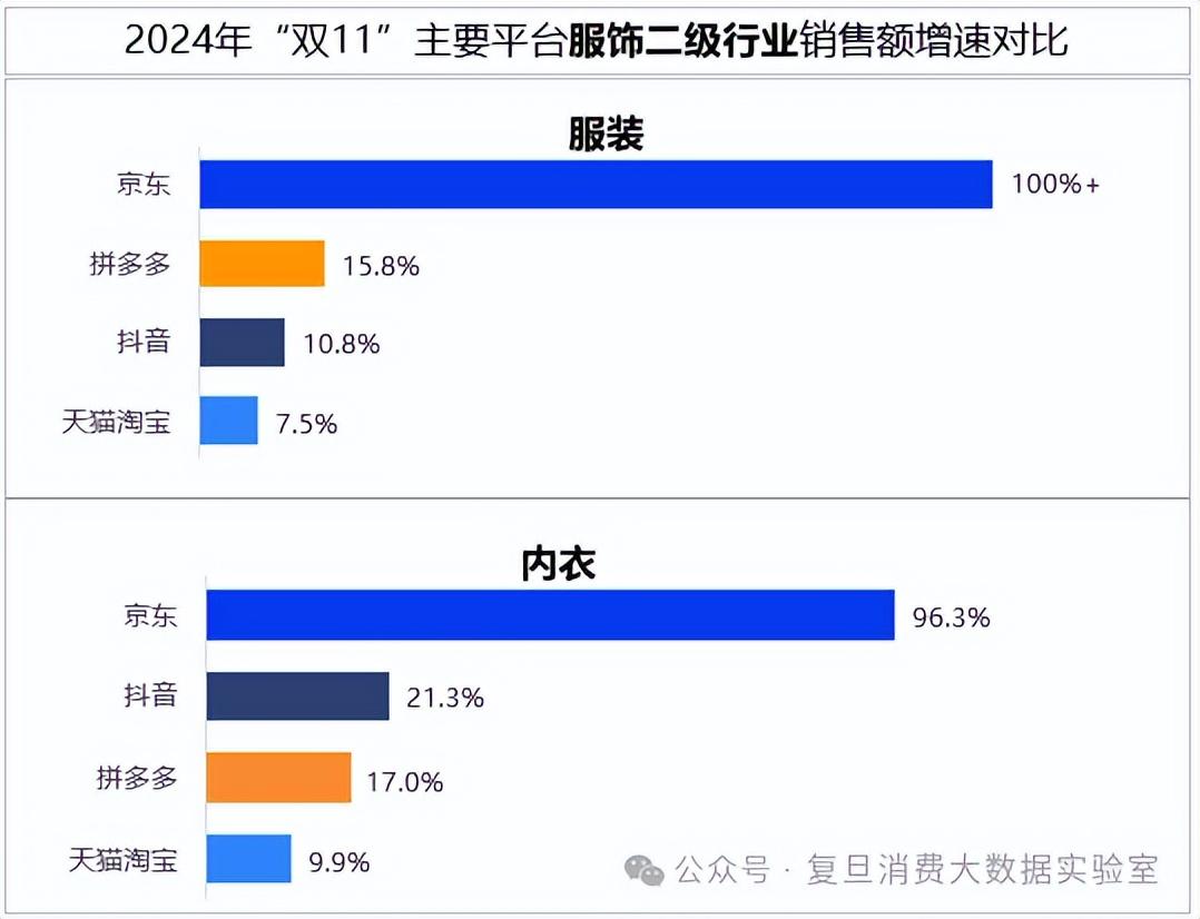 在服装、内衣这两个极为关键的二级行业中,京东服饰均实现了突破性的增长。服装领域的销售额增速超过了 100%,内衣领域的销售额增速也达到 96.3%,彰显出京东服饰在此次“双 11”大促中的强劲竞争力。