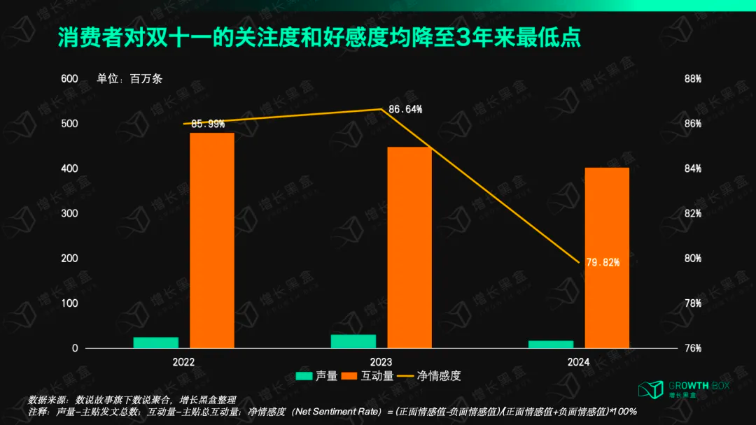 但我们发现,2024年双11期间,社媒平台上关于双11的声量、互动量均低于2022、2023年,达到近3年来最低。不仅关注度变少了,今年消费者对双11的好感度也降至3年来最低。反映在消费行为上则是,近几年主流电商平台、头部消费品牌的双11GMV增速已经明显放缓。