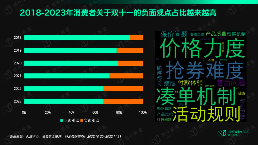 另一组数据也映射出相同的趋势,2018年以来,消费者关于双11的观点中,负面观点占比逐渐增加。