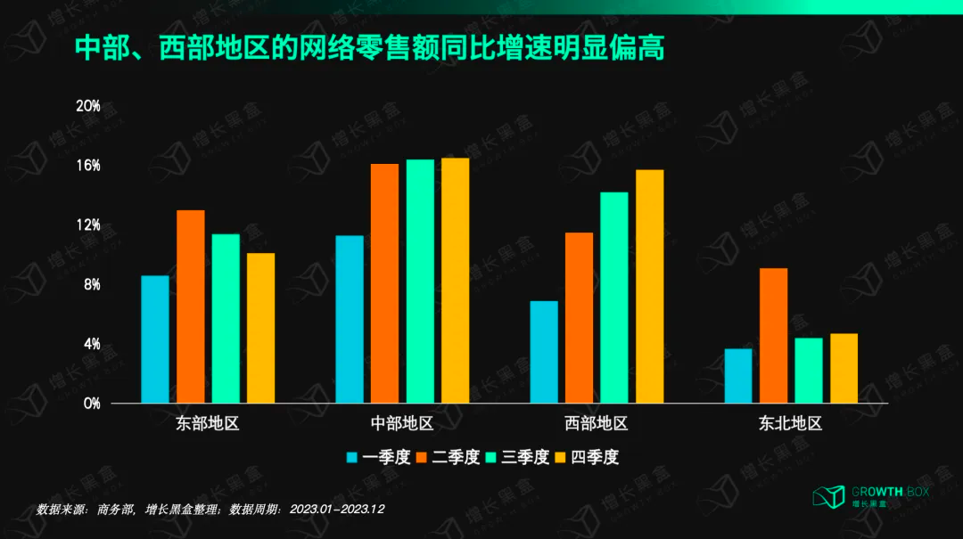 根据商务部数据,2023年中西部地区的网络零售额同比增速远高于东北地区,甚至超过经济更发达的东部地区。在未来,对比高线城市密集的东部地区,中西部地区将能贡献更高的规模增速。