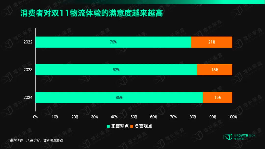增长黑盒认为,物流体验的满意度提升,是各大平台在物流时效、物流覆盖度上不断竞争的结果,更是平台之间在物流服务上的破壁、融合的共同成绩。