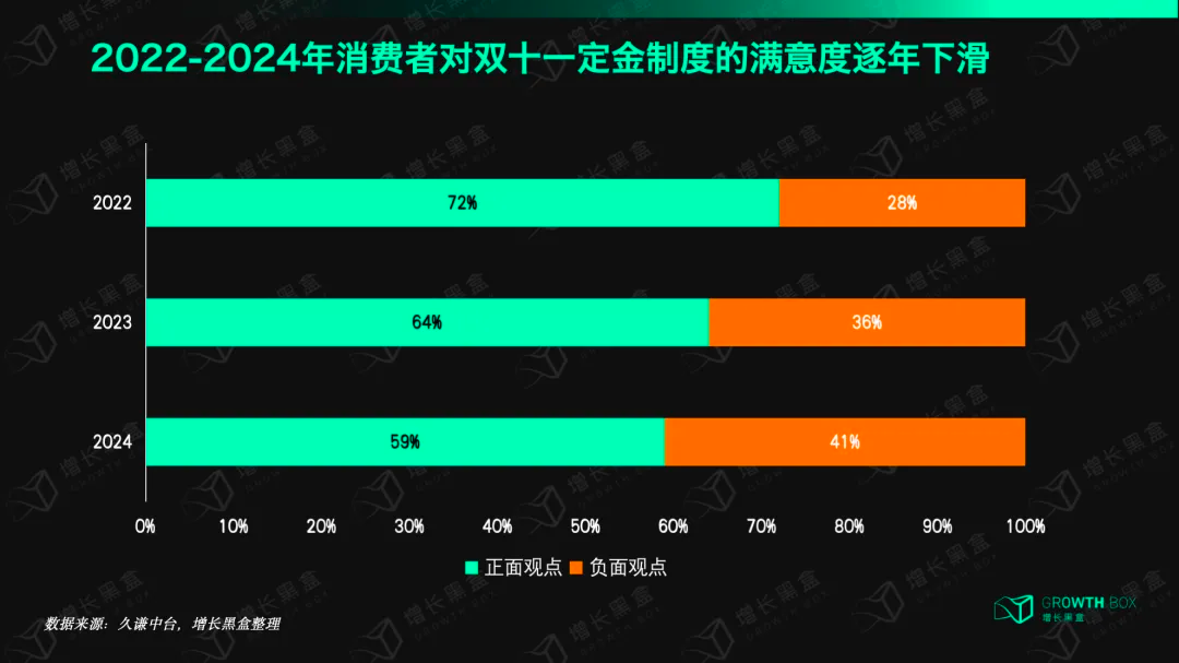 更重要的是,近三年,消费者对预售定金机制的满意度呈显著下滑态势,消费者关于双11定金机制的正负观点比例从2022年的72:28跌至2024年的59:41。
