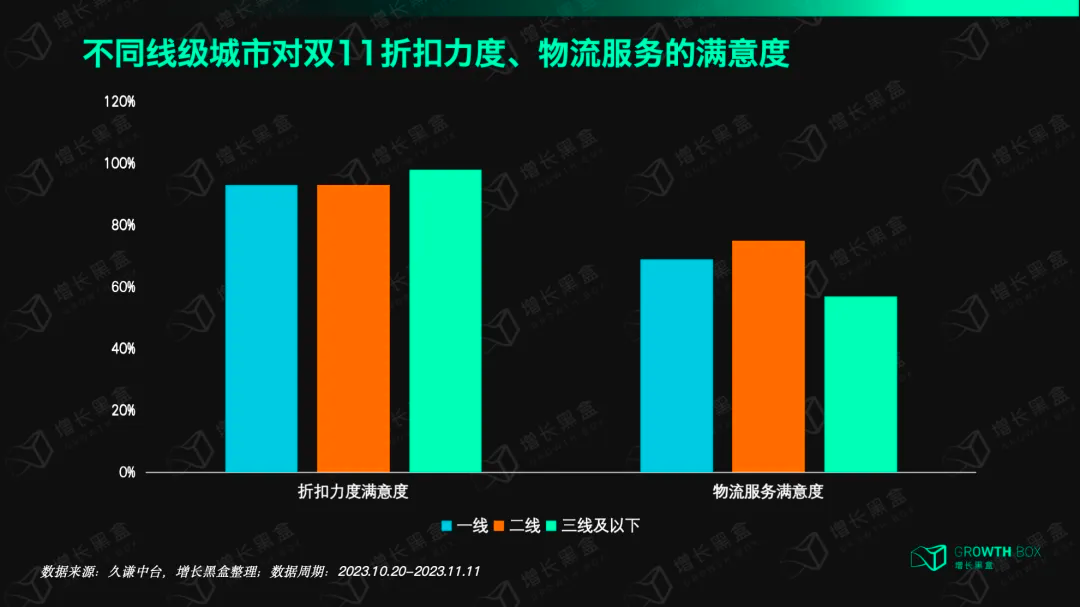 与此同时,高线城市消费者对价格不敏感,随着双11逐渐失去让人惊叹的“最低价”,这群人便很难感知其价格优势,所以折扣力度满意度较低。而且他们拥有众多线下消费选项,当下许多线下渠道的性价比已经超过线上,一定程度上拉低了高线城市消费者的满意度。
