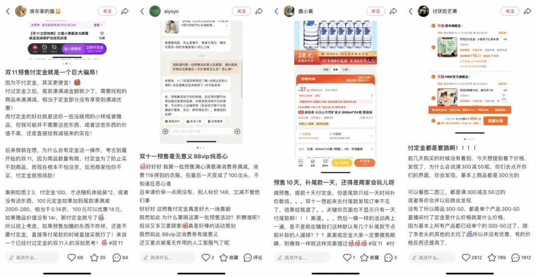 受这些因素影响,消费者对预售、付定金的兴趣不再强烈,反而选择在10月31日尾款日全款购买,或者直接在双11当天购买。小红书上有消费者生动总结:“双11真正便宜的就3天:10月31日、11月10日、11月11日。”