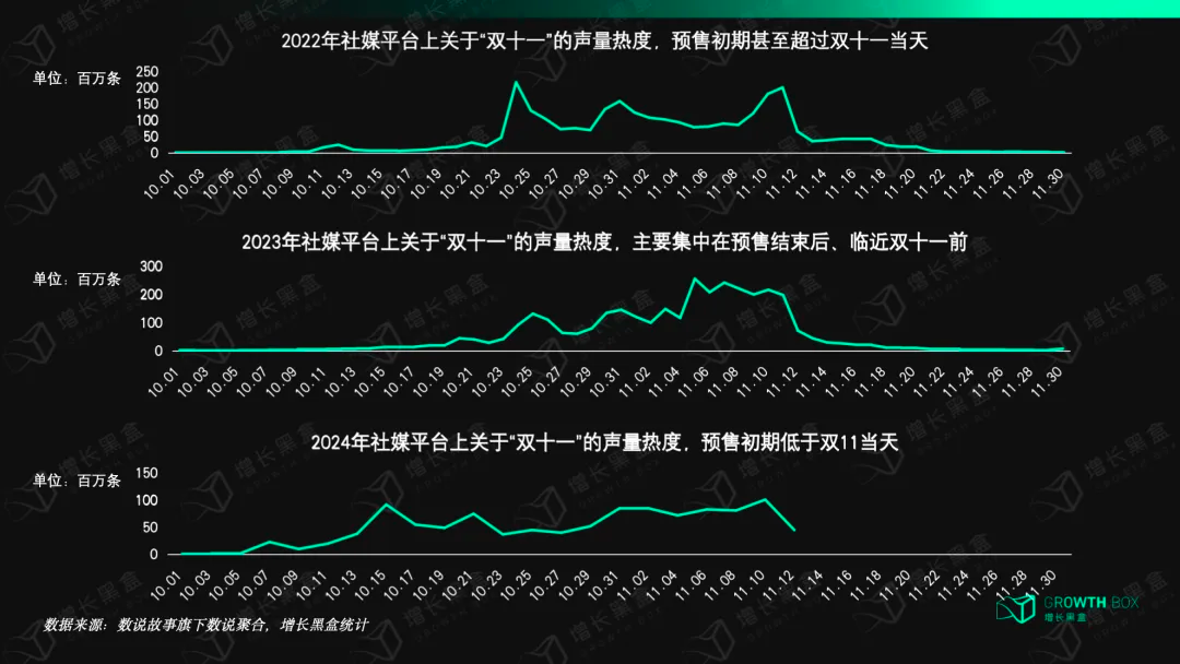 到了今年双11,预售期提前了好多,但整体热度大幅下滑,预售初期声量热度出现阶段性小高峰,但始终无法与双11当天平分秋色。