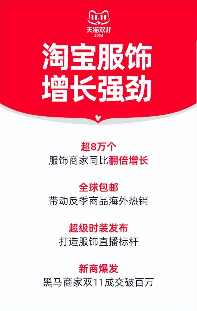 “这是近些年最好的一次双11”,一个淘宝服饰商家发了条朋友圈,“今年很辛苦,确实不容易,好在结果超预期”。2024双11收官,淘宝服饰交出了一份漂亮的成绩单,全周期有超8万个商家成交额同比去年翻倍增长。全球包邮出海红利凸显、品质直播引领行业、新商家持续涌入,成为今年淘宝服饰的三大增长引擎。