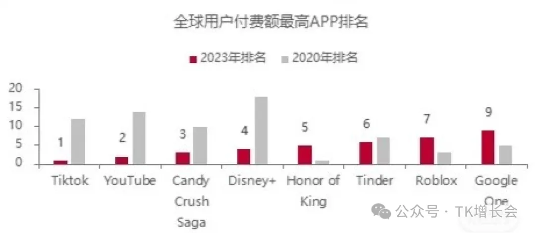 同时,根据美国某调研公司数据,2023年TikTok已经成为全球用户付费额最高APP,而在2020年仅排在12位,目前总估值已经接近2000亿美元。