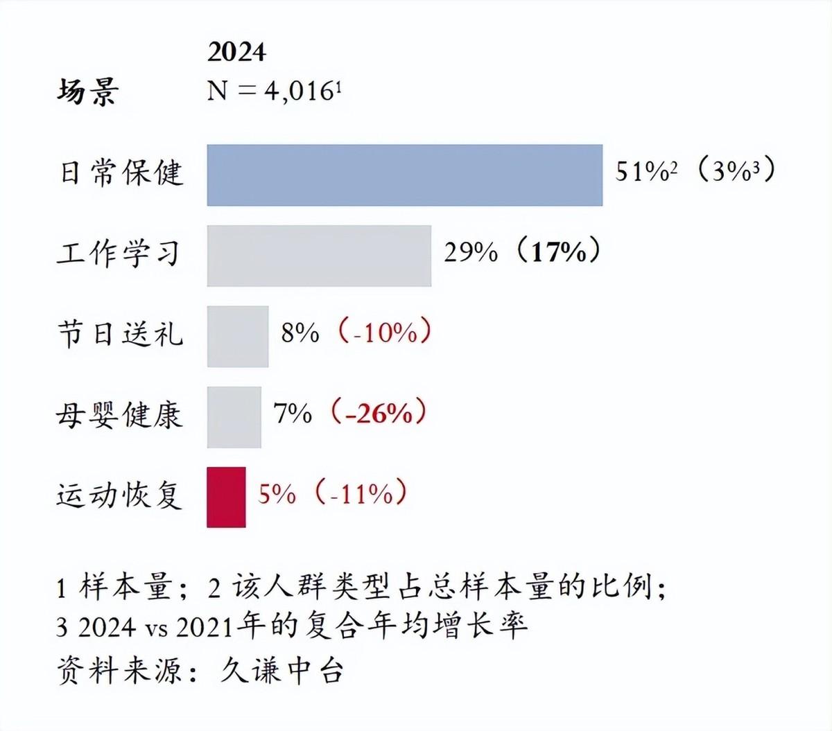 2024年,西式保健品的使用场景呈现出多样化的趋势。日常保健为最主要的使用场景,且呈现出稳步增长趋势,显示出人们对健康维护的日益重视。工作学习场景的使用比例也在增长,表明在职业和教育领域西式保健产品的需求稳定。在节日送礼场景的需求下降,反映出送礼习惯的变化和市场饱和。母婴健康场景的使用比例有大幅下降,这与生育率下降或市场竞争加剧有关。运动恢复场景的使用比例较小,并且有萎缩趋势,消费者的需求和偏好正在发生变化。