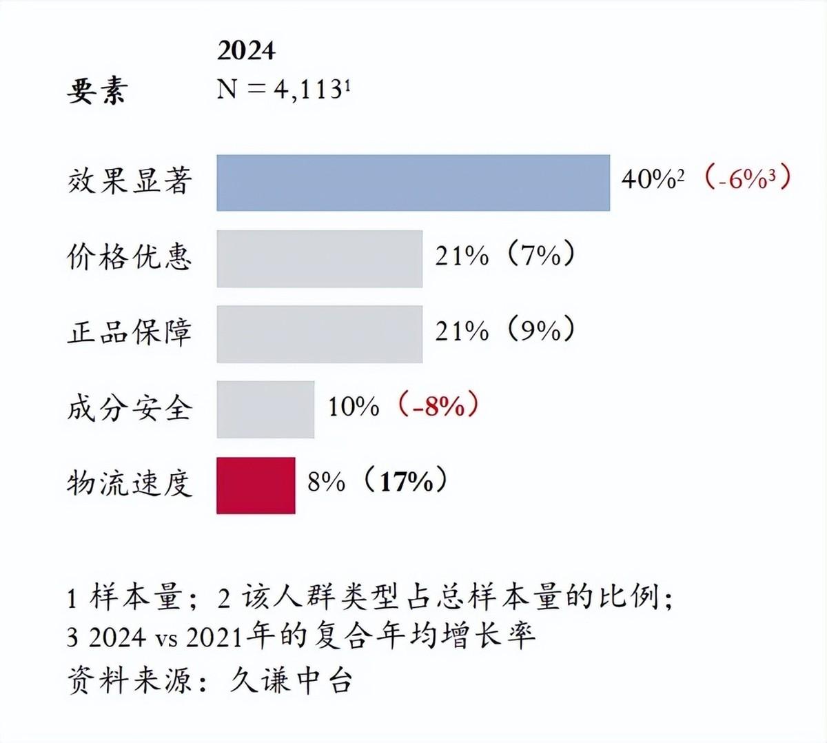 2024年,消费者在购买产品时最看重的因素是效果显著,其次是价格优惠和正品保障。然而,与2021年相比,效果显著的重要性有所下降,而价格优惠和物流速度的重要性则有所上升。这表明消费者对产品效果的期望值较高的同时,也愈发重视价格合理性和快速的物流服务。消费者对保健品功能的需求从单一的免疫力提升转向多样化健康需求,对成分安全的要求也从天然无副作用转向成分来源和配方干净度。同时,消费者对保健品的正品保障要求愈发严格。2024年的消费者更加注重购买渠道的可靠性,京东等电商平台的信任度显著提升。