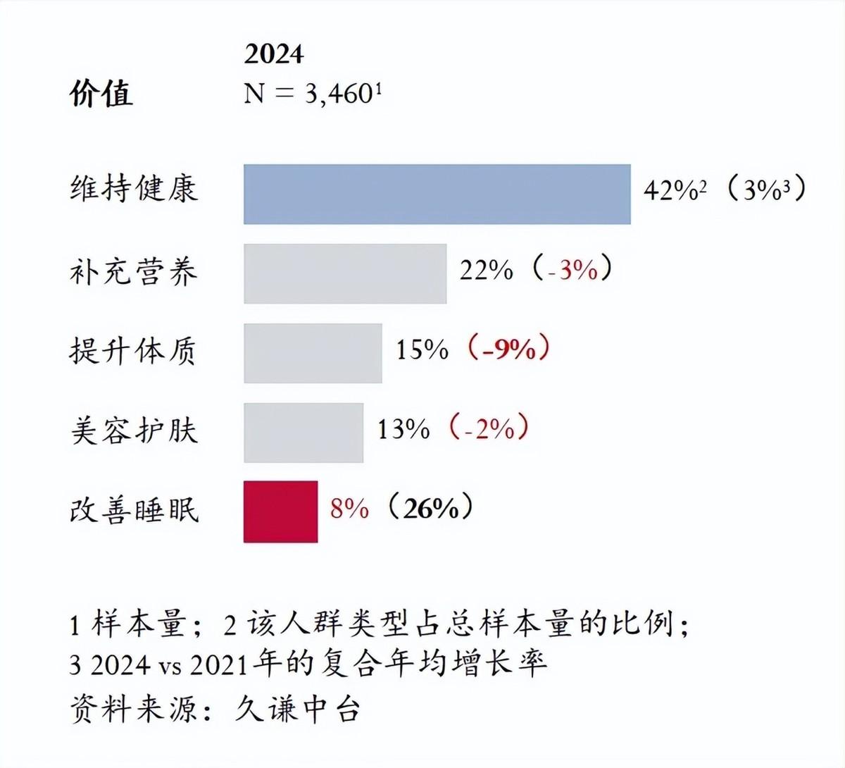 在2024年的西式保健品市场中,维持健康依然是消费者的核心需求,且该需求有稳步提升趋势,人们越来越注重长期健康维护。同时,消费者对西式保健品的需求也更加多样化,除了传统的钙和维生素矿物质补充外,对补充DHA等营养物质的关注度也在上升。西式保健品的消费者注重更全面的体质提升,尤其在增强心脏活力、提升个人精力方面。此外,西式保健品的美容护肤价值也备受关注消费者对护肤的要求不仅限于表面美观,更加注重皮肤的健康和舒适。值得注意的是,越来越多的人开始关注保健品在改善睡眠、缓解焦虑方面的效果,关注度较2021年有较大提升。