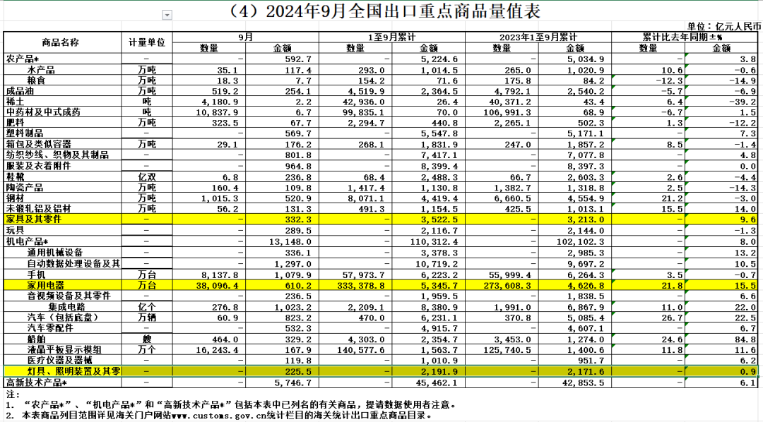 10月14日,中国海关发布9月全国出口数据,家具及其零件、家用电器、 灯具、照明装置及其零件等迎来增长,尤其家用电器和家具增长迅猛。