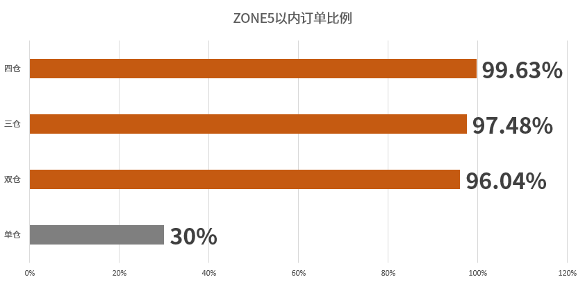 根据Zone 5区内的订单占比数据测算,大件备货到萨凡纳仓+洛杉矶仓+新泽西仓,订单总占比可高达97%以上,大幅提升ZONE区订单比例,大大缩短尾程派送时效,提升买家收货体验。