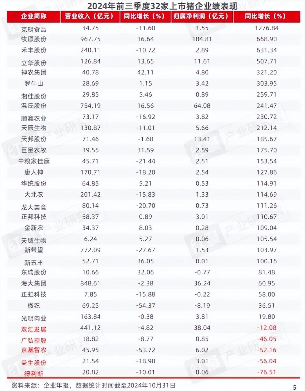 近日,32家上市生猪企业发布2024三季度业绩报告。从净利润看,29家企业上半年盈利,仅有3家企业亏损,分别是正虹科技、东瑞股份、傲农;其中净利润同比下滑的有5家企业,双汇发展、广弘控股、京基智农、益生股份、得利斯。