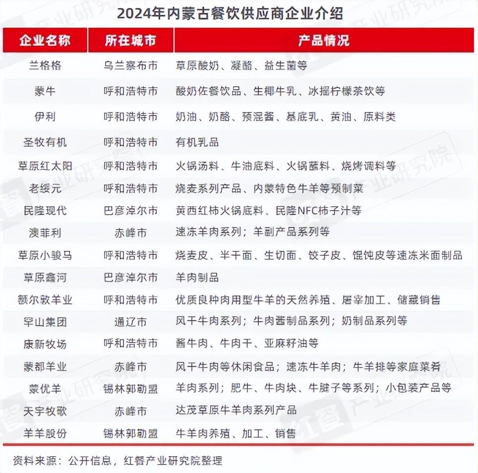 本期餐饮供应链指南月报将以内蒙古为例,介绍当地知名的供应链企业。内蒙古凭借其丰富的自然资源,不仅有大量优质的食材,还涌现出许多优质的供应链企业。例如,知名奶企伊利和蒙牛,烧麦企业老绥元,牛羊肉领域的额尔敦羊业和蒙都羊业,以及特色调味料企业草原红太阳等。