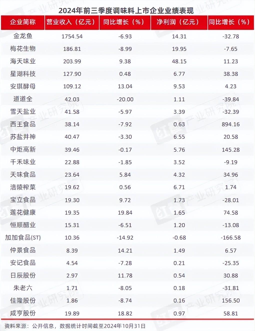 截止到10月31日,23家调味料上市企业发布三季度财报,营收格局出现了双增、双降“两极分化”的局面。实现营收净利润“双增”的企业和营收净利润“双降”的企业各有9家。