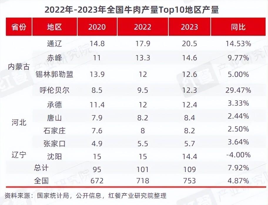 从2023年全国Top10地区牛肉产量来看,同比增幅超过全国平均有4个地区,均集中在内蒙古的呼伦贝尔、通辽、赤峰和锡林郭勒盟。