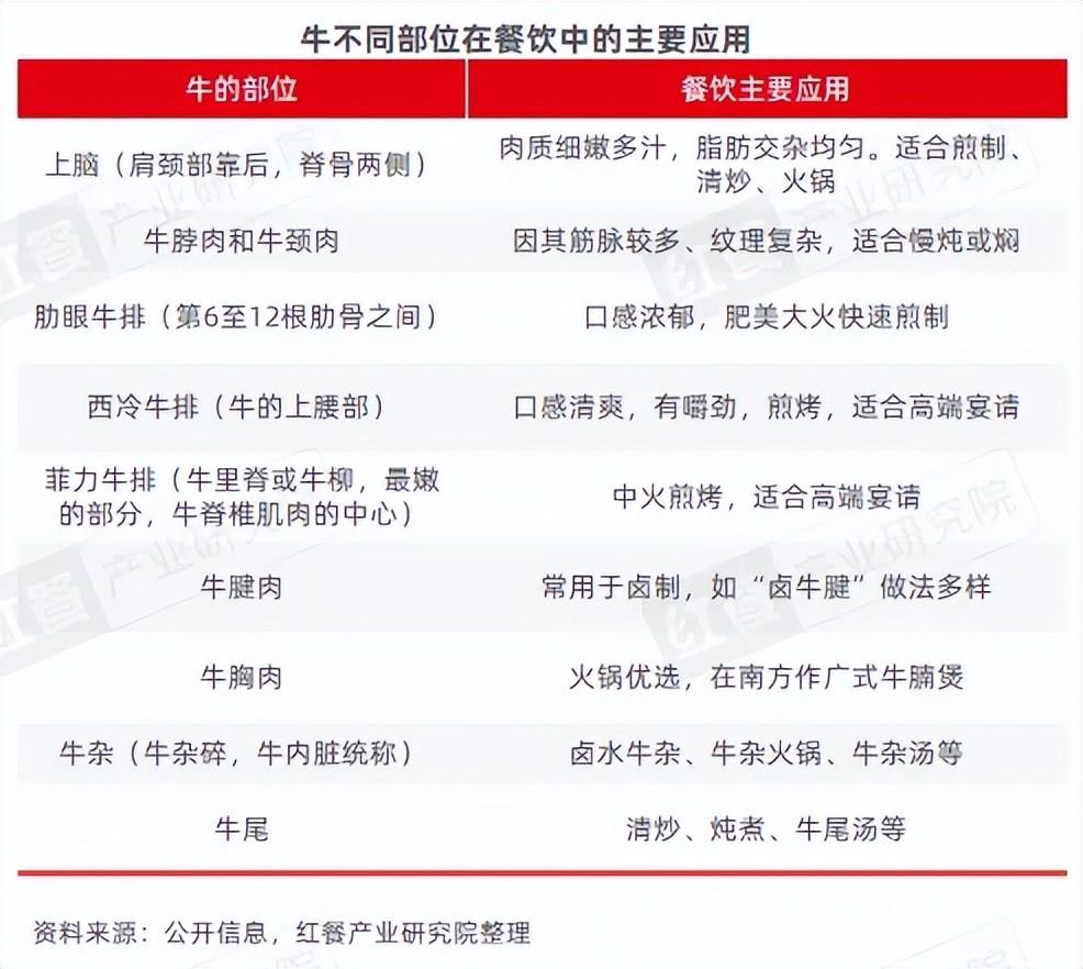 除了根据产地和品种选择牛肉,餐饮企业在采购的时候还应该需要根据具体的餐饮场景选择合适的牛肉部位。牛的不同部位适合不同的做法,如,上脑肉质细嫩多汁,适合煎制、清炒、火锅;牛脖肉和牛颈肉筋脉较多,适合慢炖或焖;肋眼牛排口感浓郁,适合大火快速煎制等。