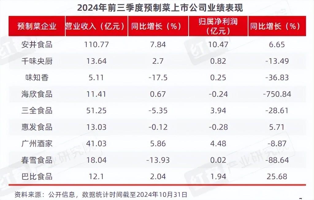 2024年前三季度,国内主要预制菜上市企业在营业收入和净利润方面表现各异。安井食品、广州酒家、巴比食品表现突出,其中安井食品净利润为10.47亿元,同比增长6.65%,较上半年9.42%的增幅有所放缓。