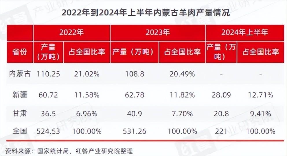 红餐产业研究院了解到,内蒙古是全国最大的羊肉产区之一。据国家统计局,2022年和2023年内蒙古羊肉产量都是全国第一,年产均超一百万吨。